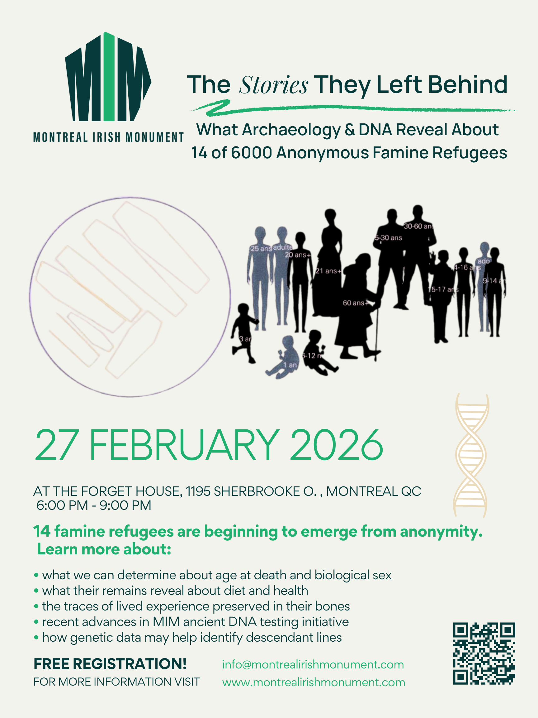 4:00 PM :Â Historical Panel: Irish famine refugees in Montreal, with historians, archaeologists, and other experts, including new insights from archaeological and DNA studies. Followed by an audience Q&A.